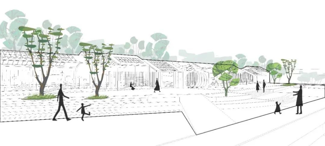 在“双向润城”的整体框架之下,基于场地的水、林、田、湖、草、村的自然要素,进而演替到“缝合生长”的生态逻辑。透过纵向的自然渗透与横向的蓝绿缝合,构建多元复合型生态立体廊道,并进一步向周边地块生长延伸,从而引导整体区域的生态体系建设与产业发展。