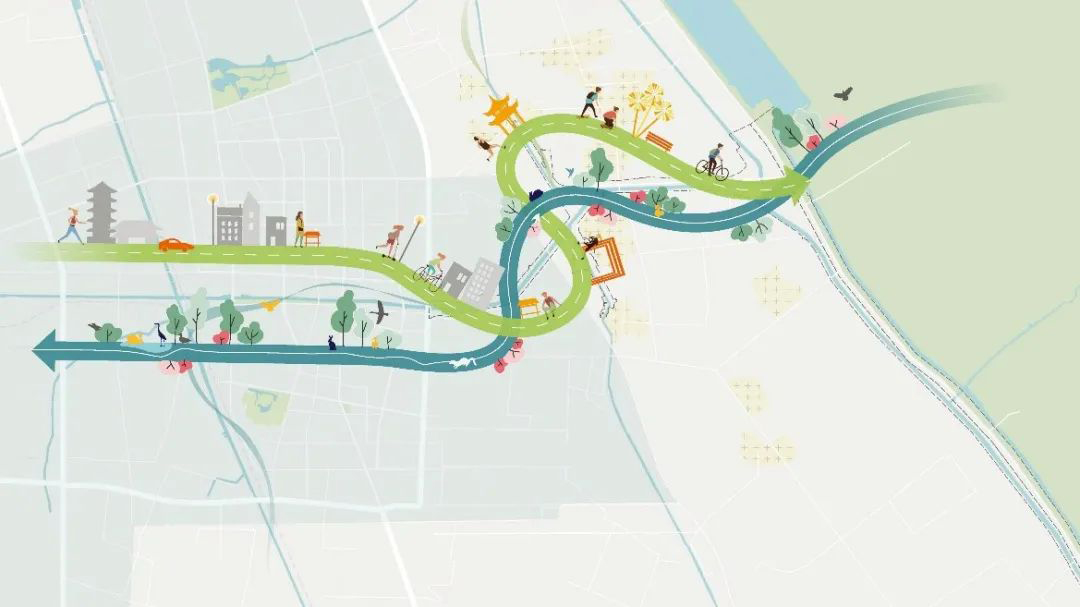 在构建丰沛运河蓝绿框架过程中,我们分析了传统分段定义的模式,单一的风貌特征分区无法达成蓝绿共融共生的生态品质双重诉求。根据沛县入微河道水体双向流动的水文特征,创新性提出了“双向润城”的空间格局——将参与式生境从微山湖/南四湖带进城市,让公众生活漫行到湖边风光。